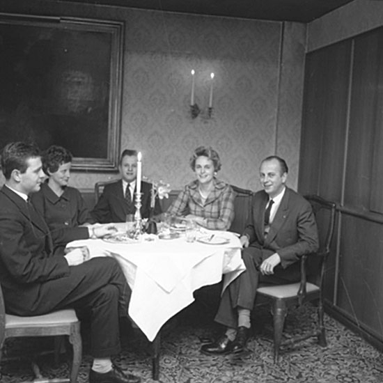 Nyårsfirande på hotell Laxbrogården, grupp fem personer vid bordet.