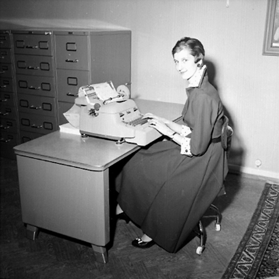 Kontorsinteriör, en kvinna vid skrivbordet.