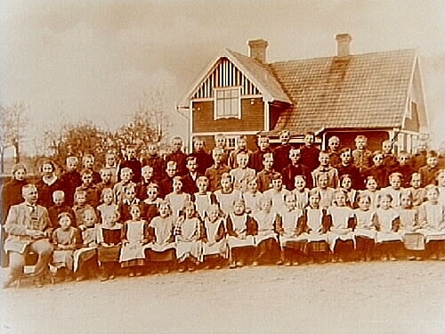 Gällersta skola, en och en halvvånings vinkelbyggt skolbyggnad i bakgrunden. 68 skolbarn med folkskollärare Albenius.