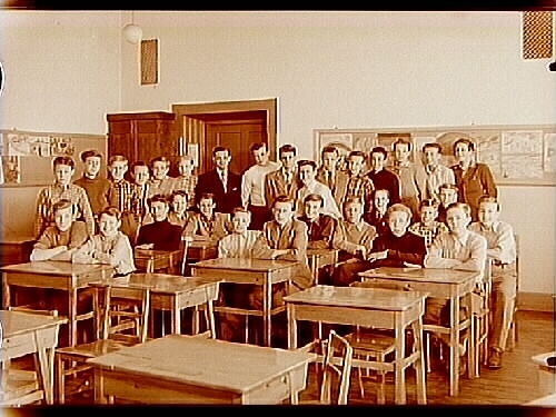 Olaus Petriskolan, klassrumsinteriör, skolpojkar med lärare Tore Zötterman, klass 8A, sal 20.