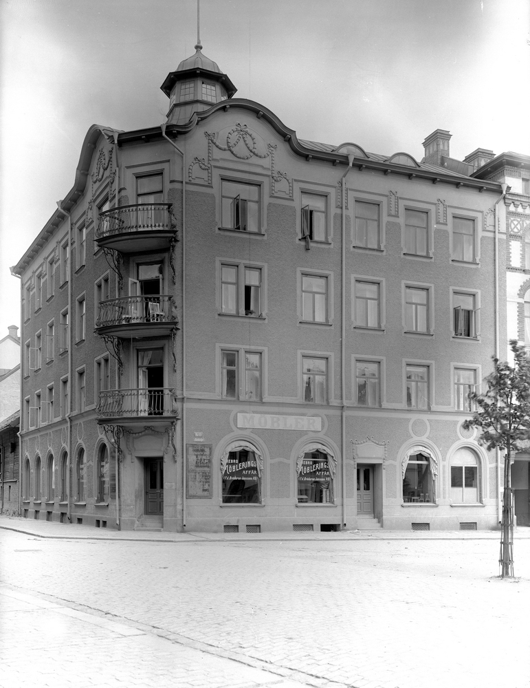 Örebro Möbleringsaffär, trevånings hyreshus med torn på taket.