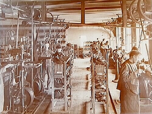 AB Skofabriken Kronan, fabriksinteriör, 9 skoarbetare som klackar och snittfräser.
