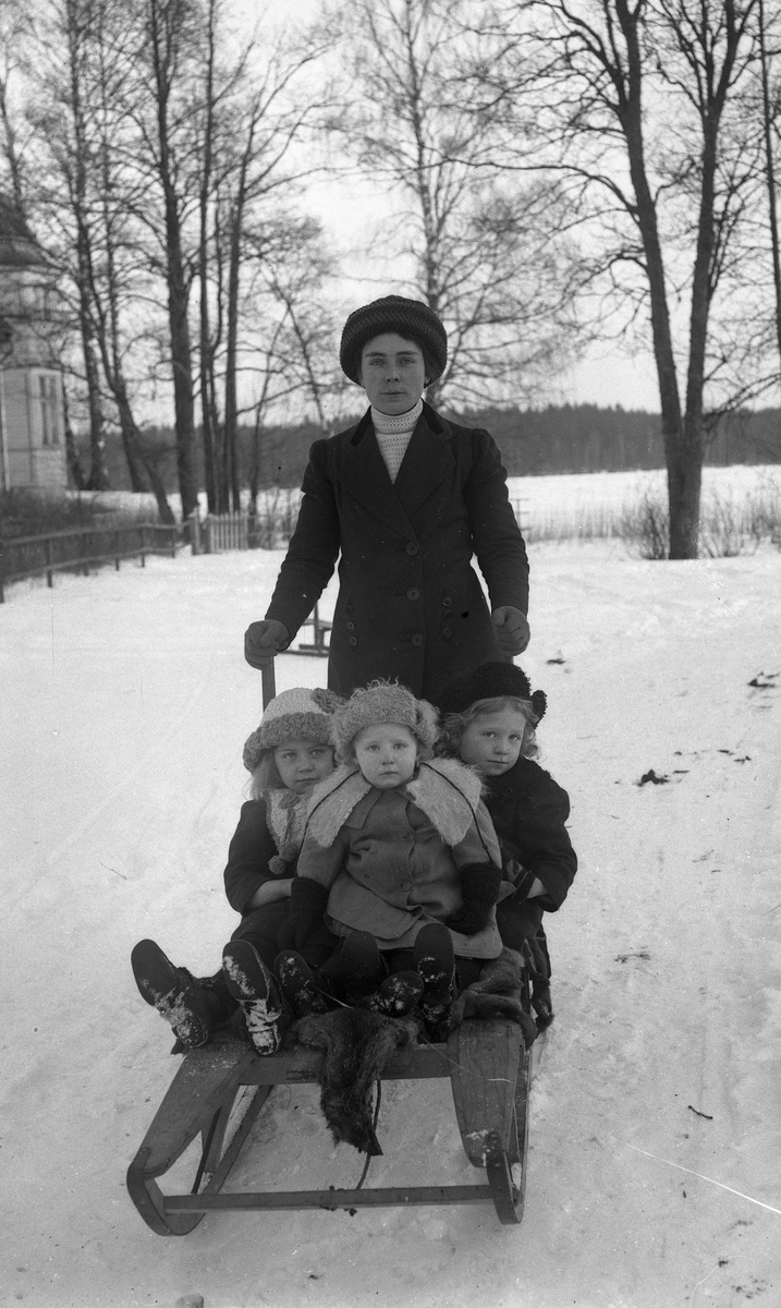 Kvinna med tre barn på spark