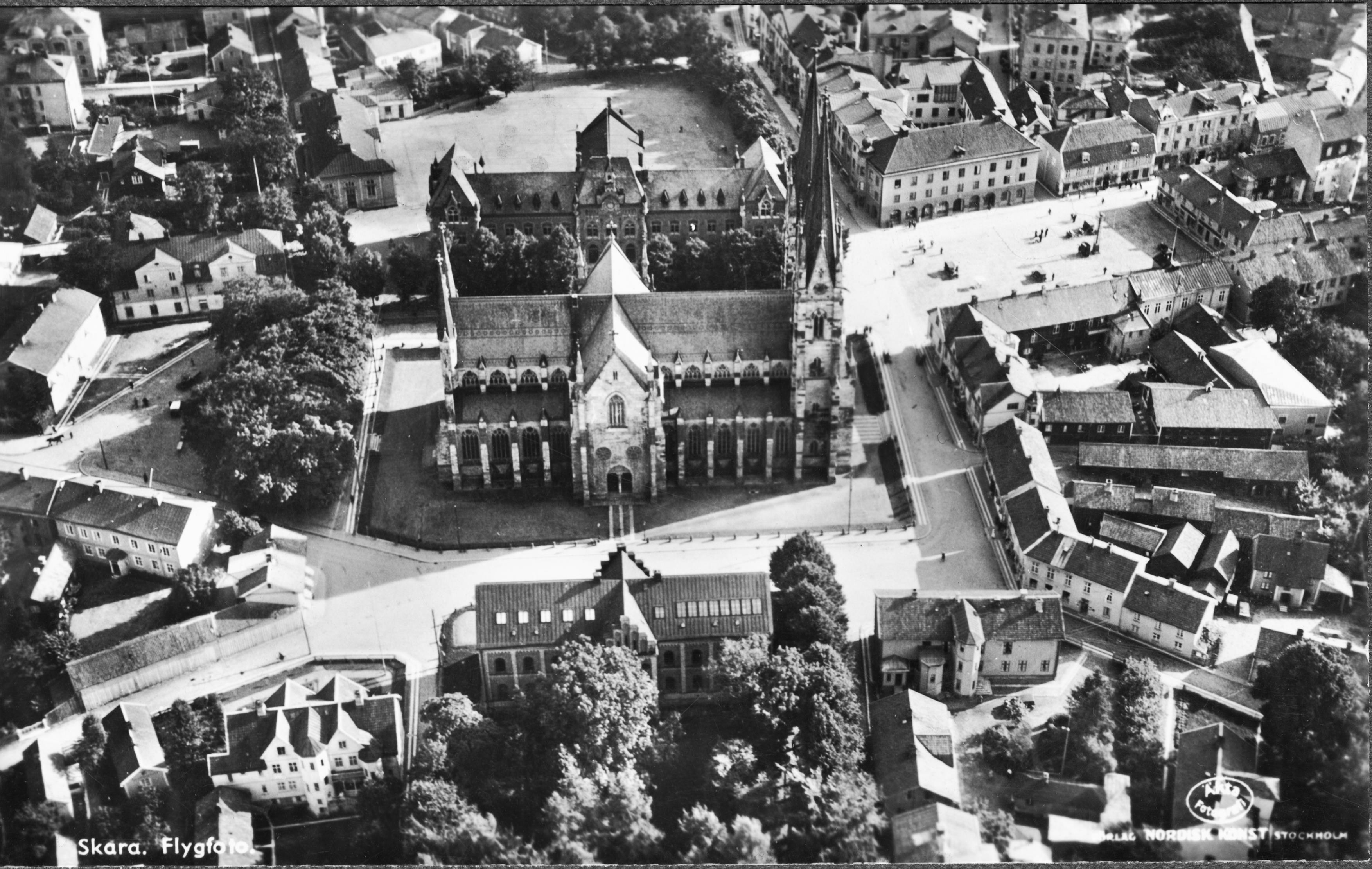 Kyrkan och dess omgivning från norr. Flygfoto. Vykort.
