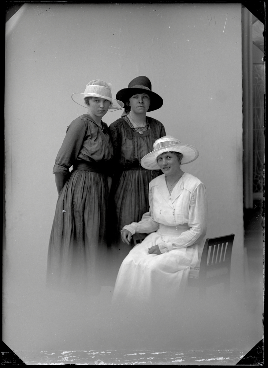 Tre unga kvinnor i tjusiga hattar