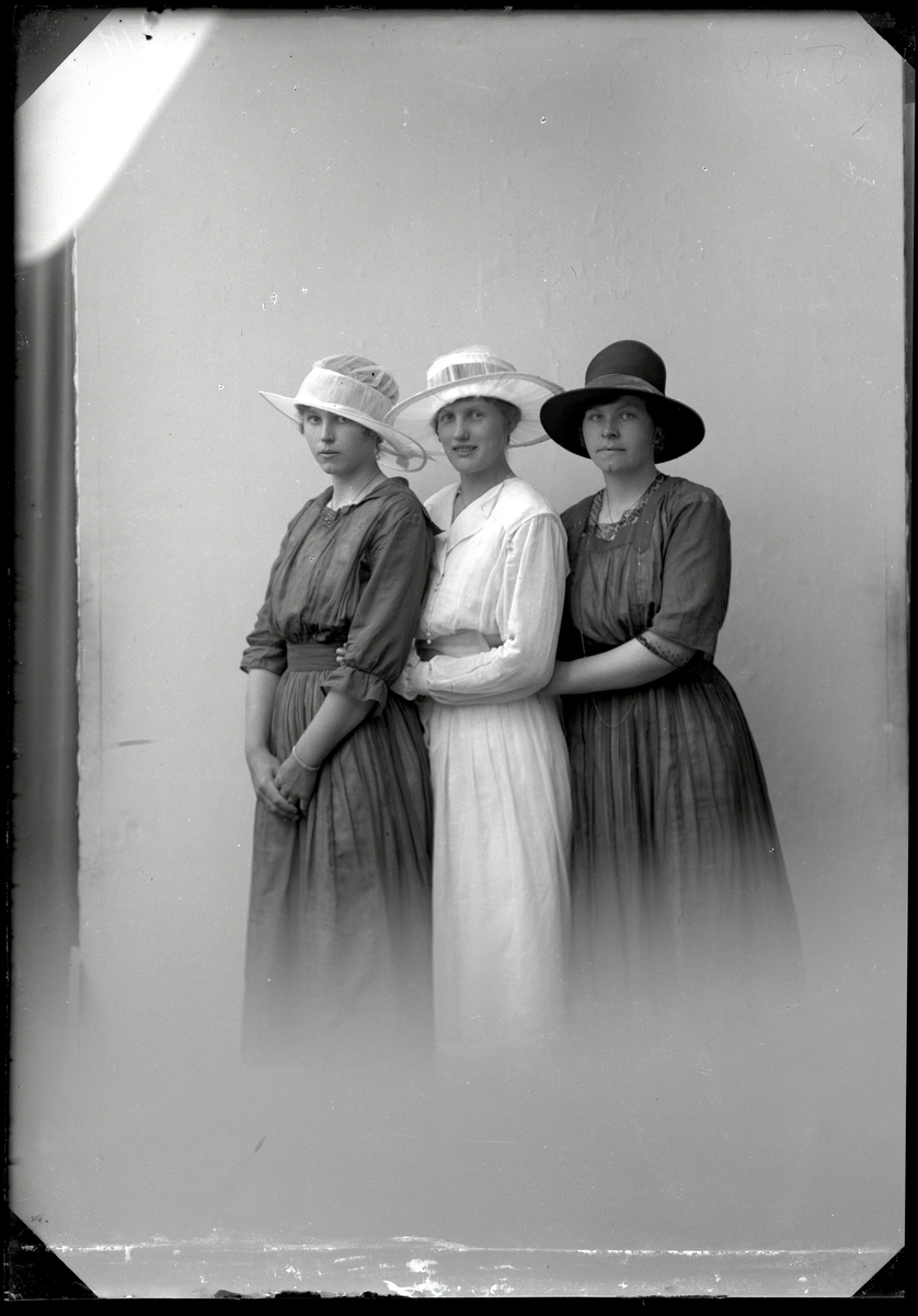 Tre unga kvinnor i tjusiga hattar