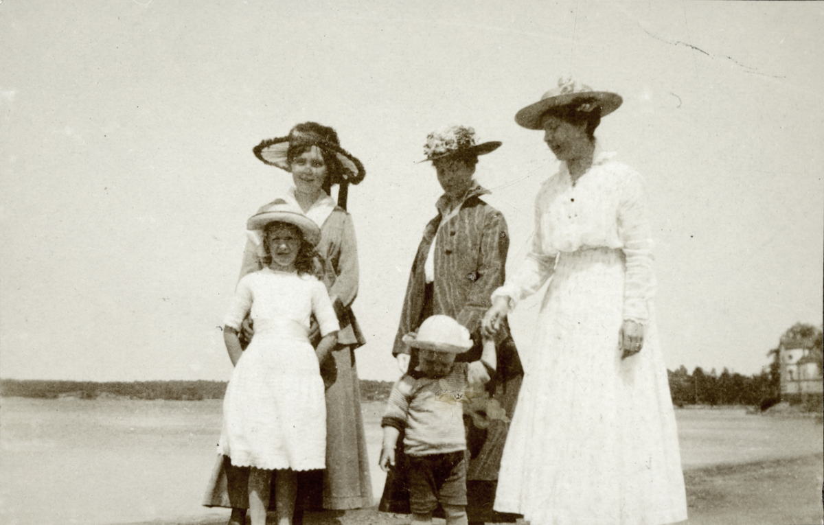 Tre kvinnor i tjusiga hattar, med barn