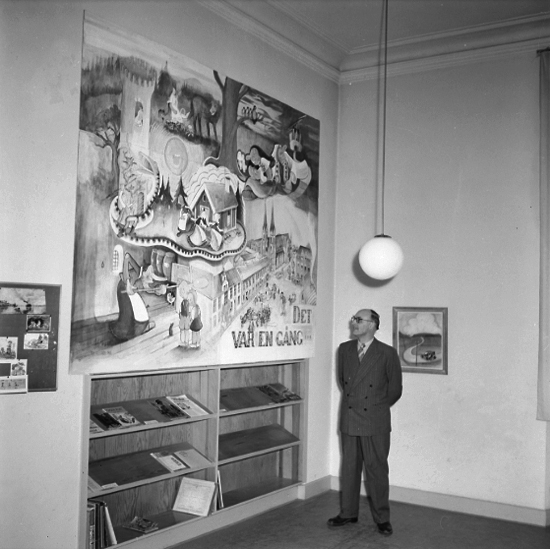 Tor Hellström avtäcker sitt konstverk "Det var en gång" på bibliotekets barnavdelning 1951.
