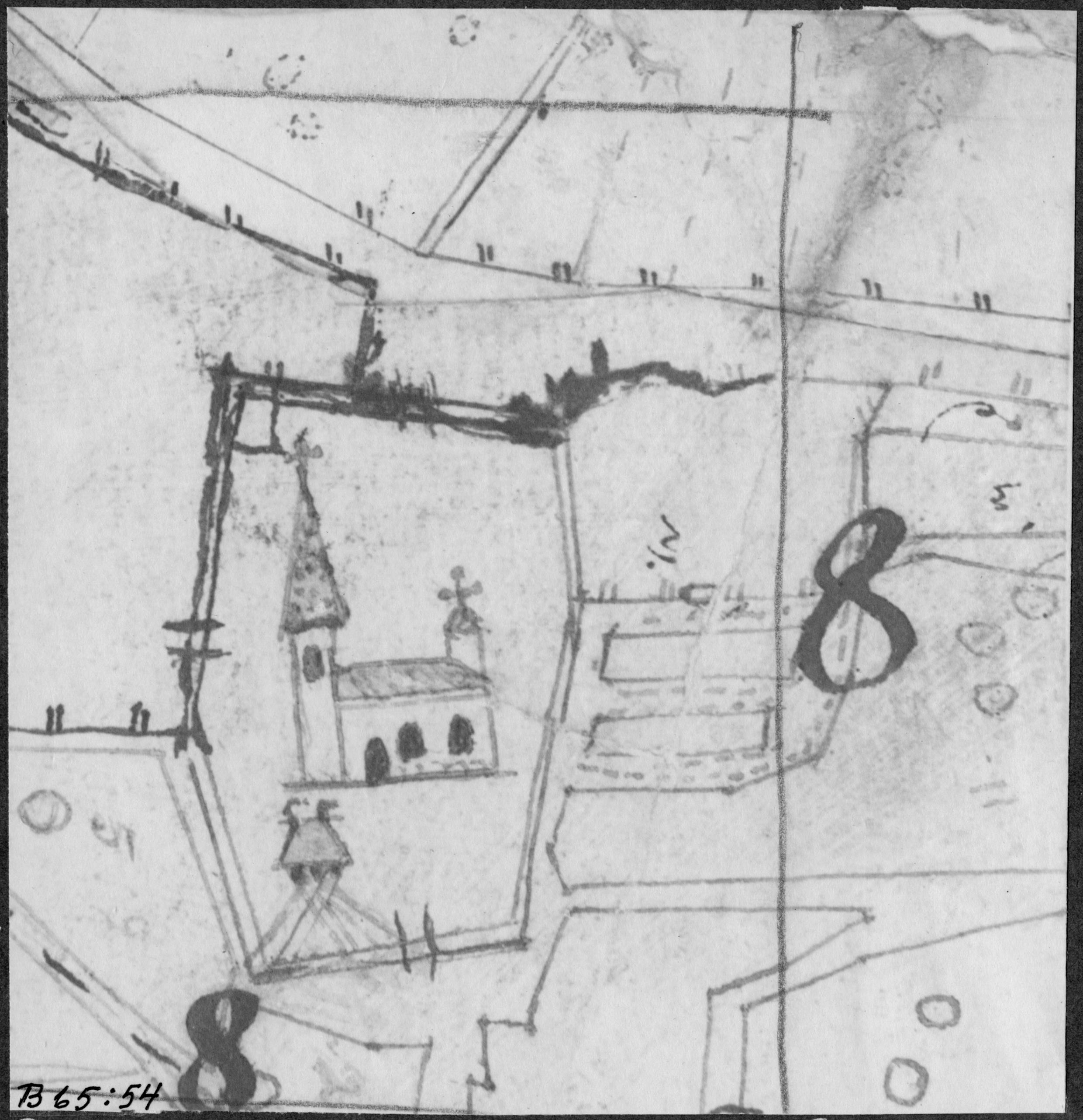 Rinkaby kyrka med omgivningar. Foto av utsnitt ur karta över Rinkaby inägor 1759 i Örebros lantmäterikontor.