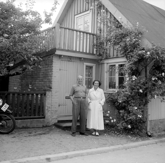Läroverksadjunkt Ernst Carlsson med makan Iris framför sommarvillan i Båstad 1955.