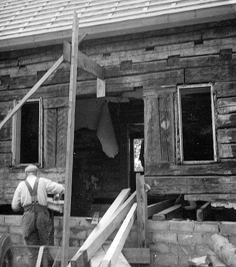 Manbyggnaden under restaurering, detalj av östra fasadens ingång.