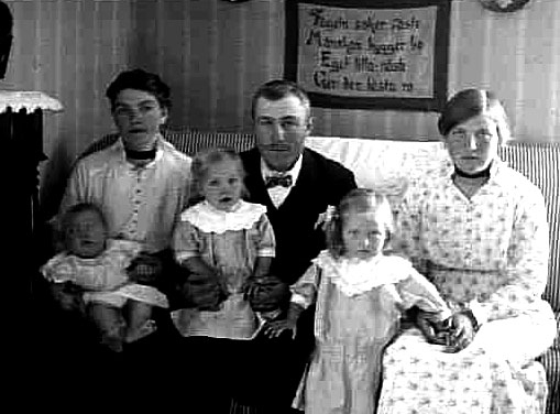 TRE VUXNA OCH TRE BARN, DE TILL VÄNSTER ÄR EN FAMILJ. DE SITTER ALLA I SOFFAN I FINRUMMET.EN VACKER VÄGGBONAD PÅ VÄGGEN.
