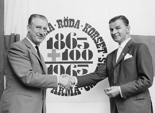 Ordförande i Röda Korset, Erland von Hofsten tackar generaldirektör Nils Hörjel för det