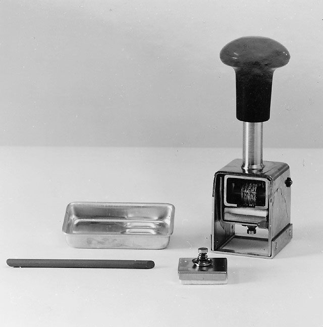 Datumstämpel, stativstämpel av metall, med handtag av plast. Art.nr