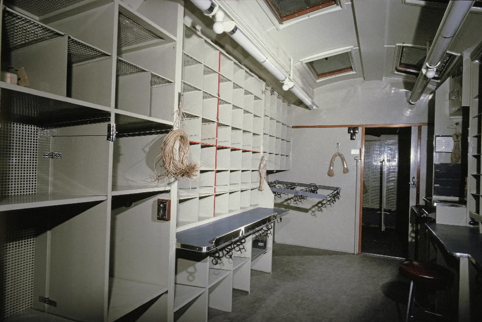 Titel: Interiör av ny modell av järnvägspostvagn, uppställd vid postkontoret Stockholm, den 7 november 1963.