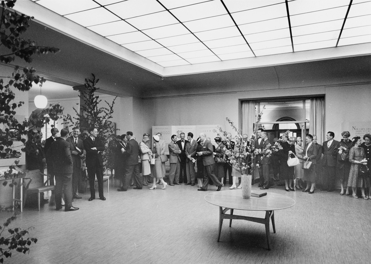 Utställningsbesökarna strömmar in i stora hallen på nedre botten,