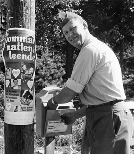 Lantbrevbärare Erik Johansson tömmer brevlådan vid postlådesamlingen i Alsvik.