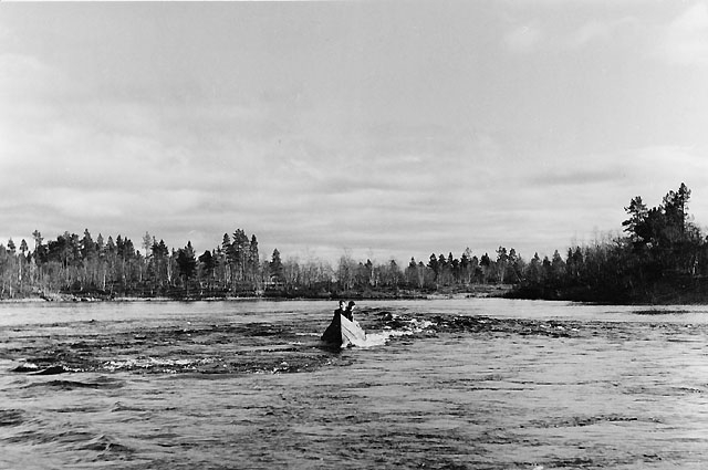 Sarri styr båten skickligt och säkert uppför Paitajärvis forsar.
