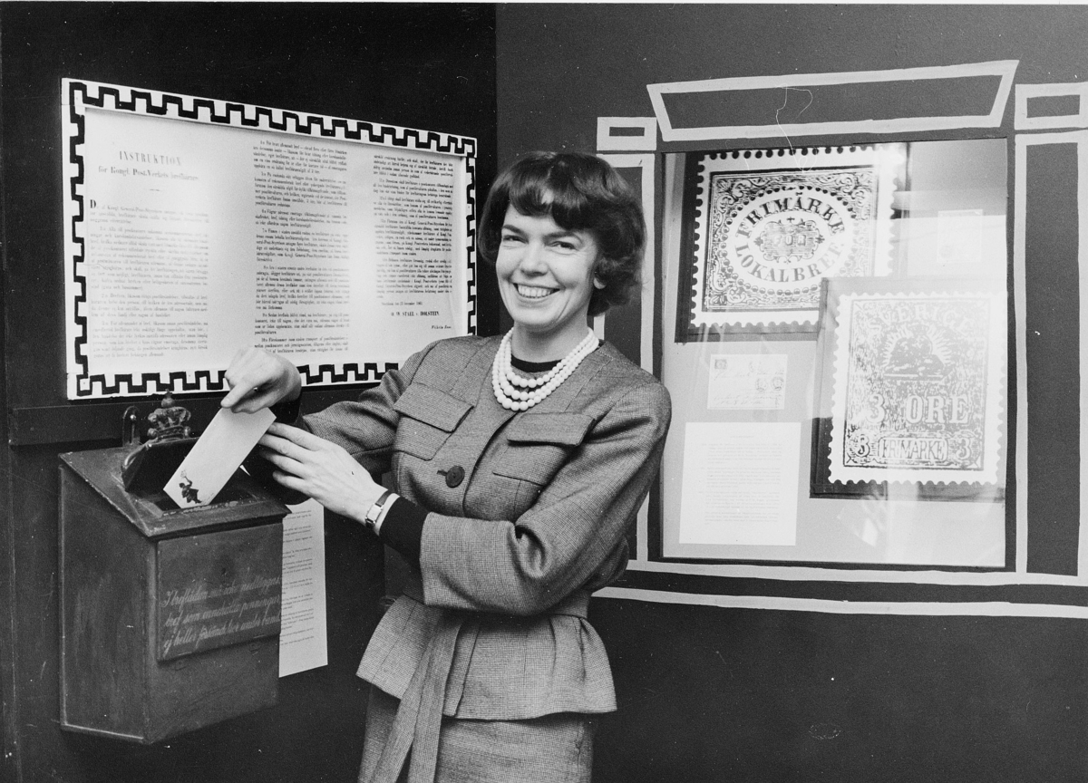 Fru Paija Smidt, från Postbankens reklamavdelning, är utställningens formgivare.