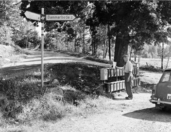 Lantbrevbärare Erik Johansson vid brevlådesamling vid Gallboda, Nykvarn. Bilåkande lantbrevbäraren Johansson på linjen Åkersberga-Singö-Björnhuvud-Åkersberga.