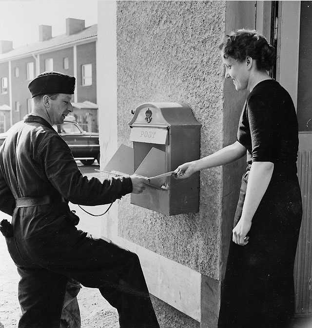 efter det att postsäckarna lämnats. Till höger fröken Berit Carlsson,
