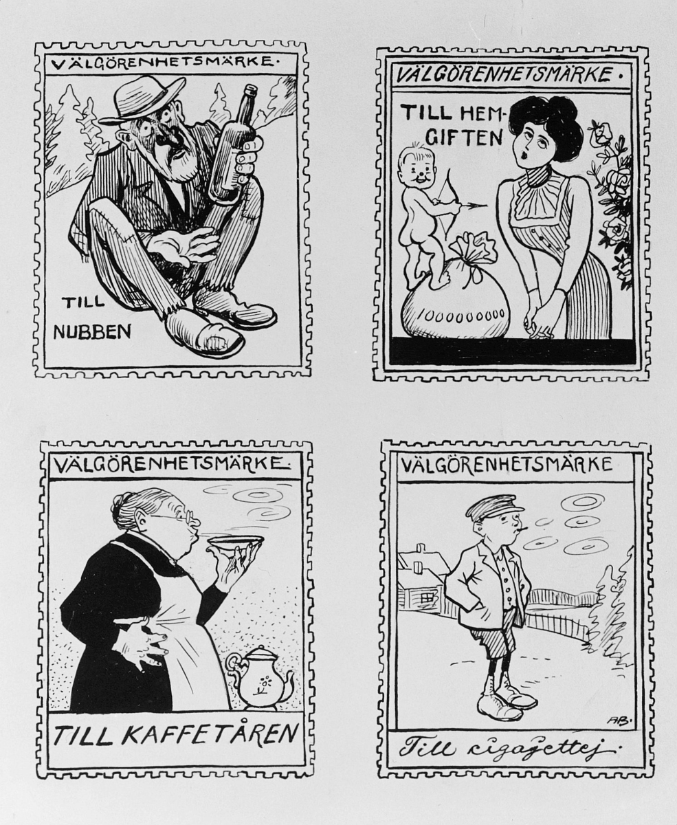 Nya Välgörenhetsmärken. Enligt skämttidningen Kasper nr 52, 30