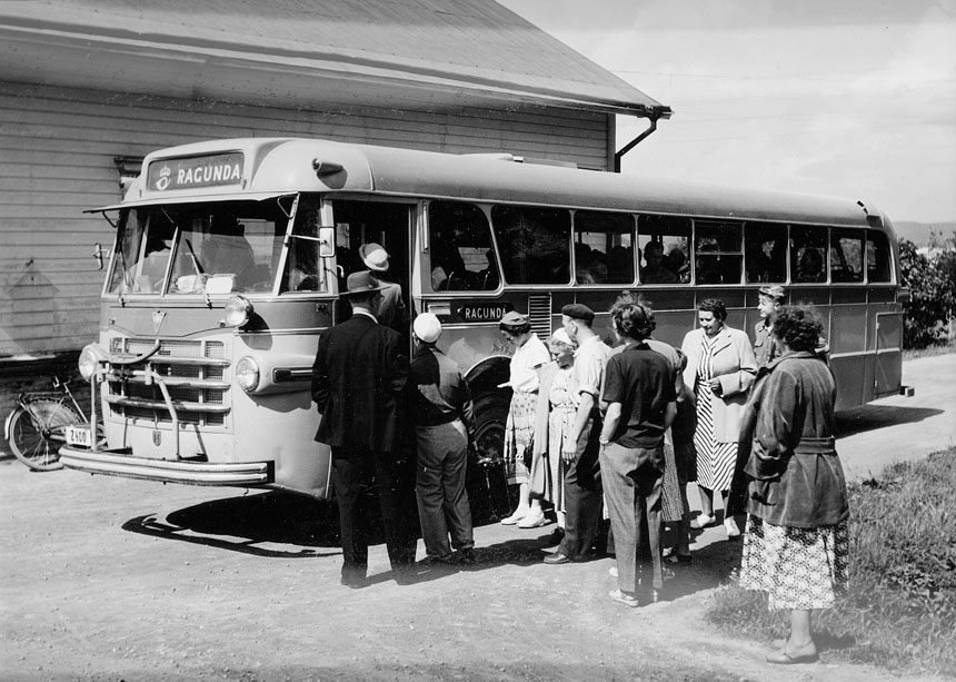 Bildiligens på linjen Östersund - Ragunda, Juli 1953. Resande mot Ragunda kliver på bussen vid poststationen i Pålgård.