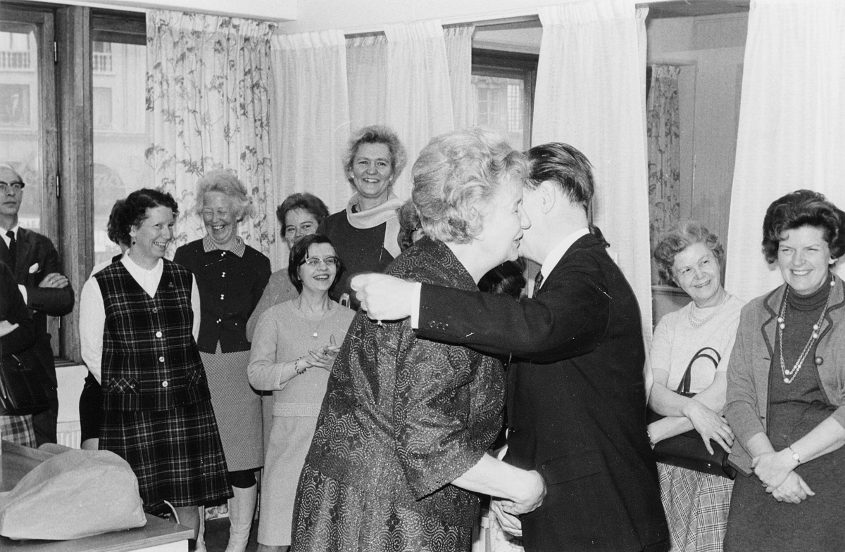 Fru Elvy Eriksson-Nowacki blir omkramad av ekonomidirektör Elof