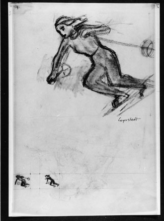 Skisser - förslag - till frimärke VM på skidor, utgivet 12/3 1954. VM hölls i Falun och Åre. Konstnär: Georg Lagerstedt.