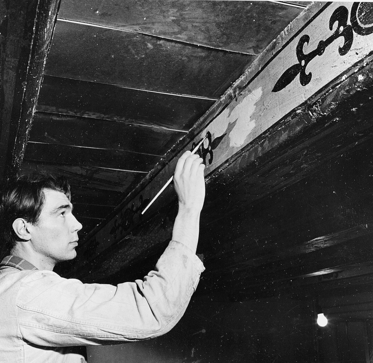 bjälklag med mål- ningar från omkring år 1640. Arbe- tet utförs här