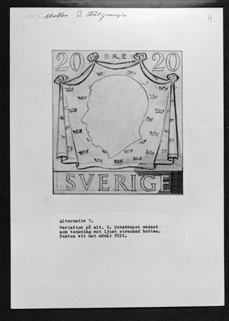 Bidrag till 1951 års tävling om ny frimärkstyp med Gustaf VI Adolfs porträtt. Konstnär: Mark Sylwan, med motto: "I stålgravyr". Alternativ 7. Blyerts.