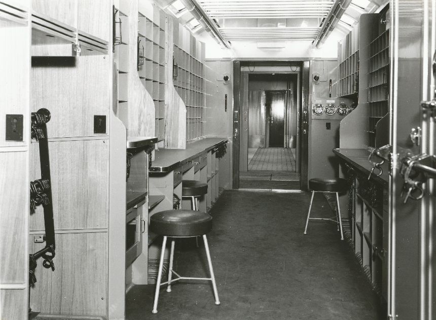 Fotografi föreställande interiören av järnvägspostvagn SJ DF033 4544, tillverkad 1953.