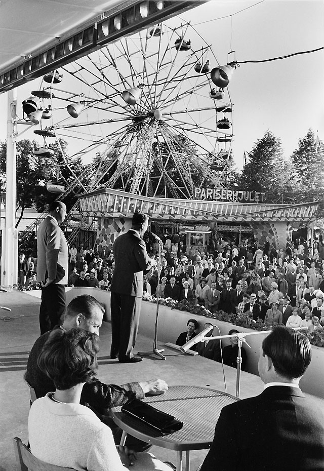 Nils Hörjel håller tal till publiken från stora scenen. Bakom honom