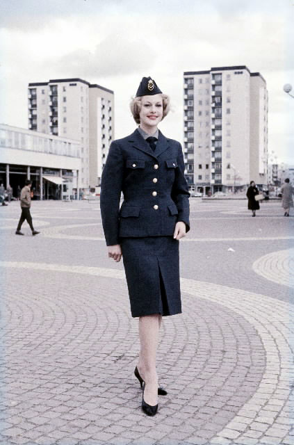 kjol samt uniformsmössa - båtmodell. Bilden tagen på Vällingby torg, 1960.