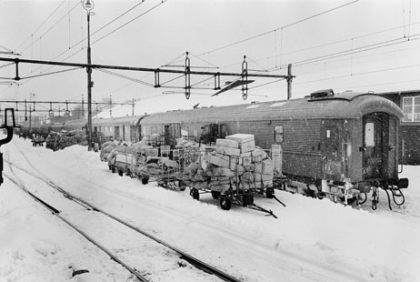 Titel: Posten från pkp 310 lossas i Boden. De stora postmängder som lossas och lastas bär syn för sägen att "Nordpilen" är en postal huvudförbindelse till övre Norrland. Vid spåren närmast står vagnar med den post som skall lastas in i pkp 308 f.v.b. Kiruna.