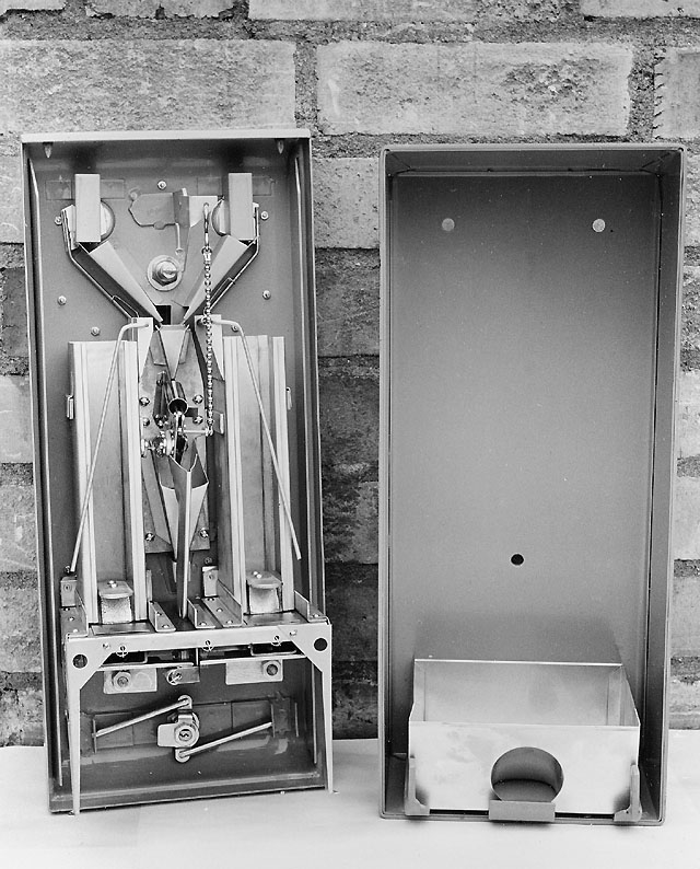 T.h. främre halvan av automaten, med myntbehållaren nedtill.