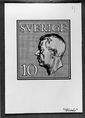 Bidrag till 1951 års tävling om ny frimärkstyp med Gustaf VI Adolfs porträtt. Konstnär: Iwan W. Fischerström.