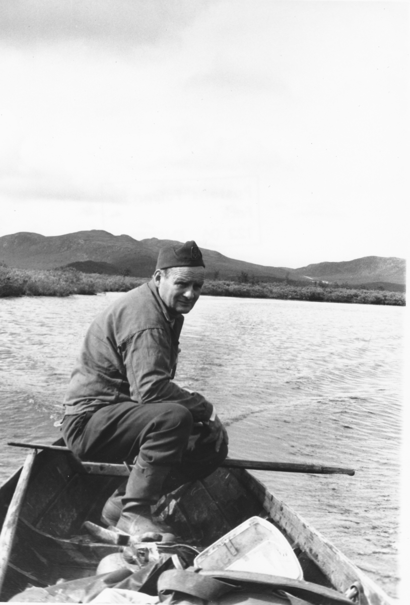Lantbrevbärare Martin Niva i sin forsbåt på väg till Kummavuopio. Bilden är troligen tagen sommaren 1970.