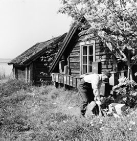 Brevlådsamling vid Östra Lagnö. Lantbrevbärare (cyklande) Sven Eriksson, från Ljusterö, under brevbäringstur mellan Västra Lagnö till Lagnö Ö (c:a 7 km).