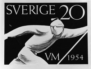 Förslagsteckningar till frimärke VM på skidor, utgivet 13/2 1954. VM hölls i Falun och Åre. Konstnär: Stig Blomberg.