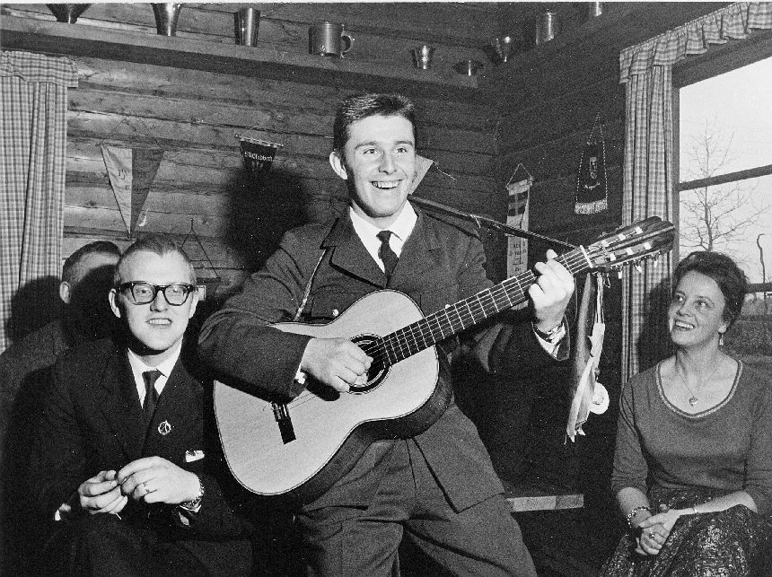 den 22 april 1963. På Hellasgården bjöd Föreningen Postfolket på kaffe och smörgås. Björn Åke Lingsten, från Gunnarn i Västerbotten, har fått låna fru Ander´s gitarr och underhåller sina kamrater tillsammans med Arvid Norén, Föllinge.