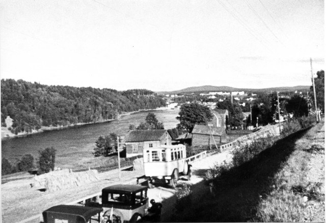 och två personbilar på en landsväg. Älv i bakgrunden.
