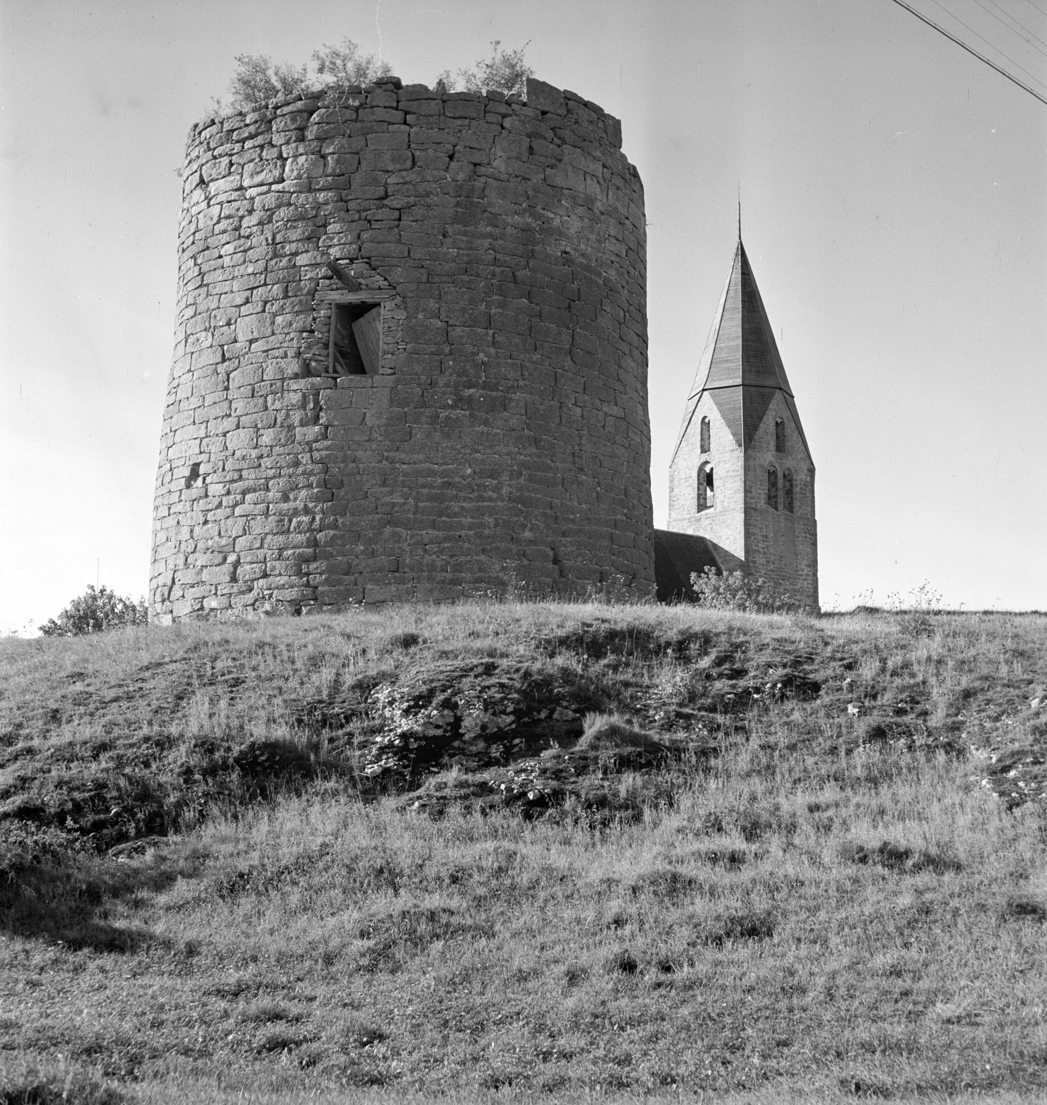 Beskrivning: Sundre kyrka och kastal (förvrängning av kastell). Bild tagen på 1940-talet.