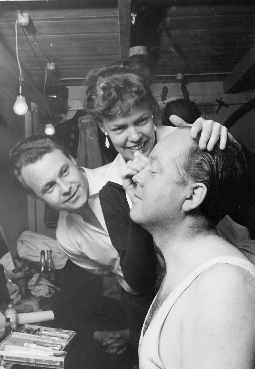 Knut Göransson får hjälp med sminkningen av Paija Smidt, medan Rune