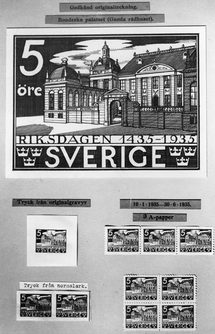 Frimärksförlaga till frimärket Riksdagen 500 år, utgivet 1/10 1935. Samtliga valörer tecknade av Olle Hjortzberg. - 5 öre. (Gamla rådhuset, bondeståndets plenilokal). Valör 5 öre.