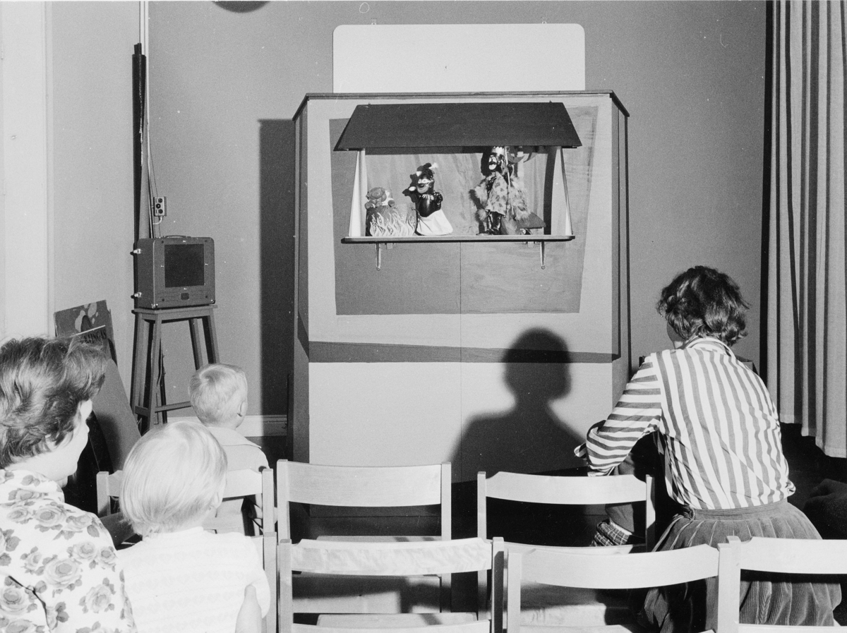Scen ur postsparbankens kasper-teaterföreställning "Sparslanta far