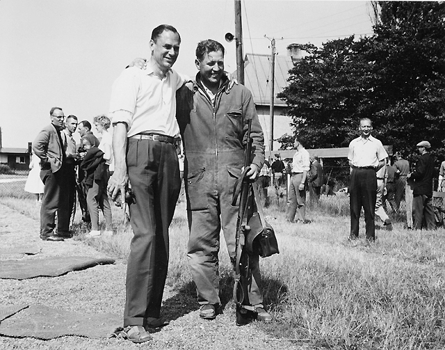 Generaldirektör Erik Swartling, t.v., klappar om mästerskytten i