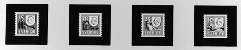 Bidrag till 1951 års tävling om ny frimärkstyp med Gustaf VI Adolfs porträtt. Konstnär: Anders Beckman.