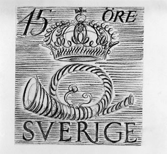 Nya frimärkstyper i valörerna 45-55 öre 1951. Ej realiserade förslag. Konstnär: Mark Sylwan. Förslag med motiv: krona och posthorn, i blyerts. Valör 45 öre.