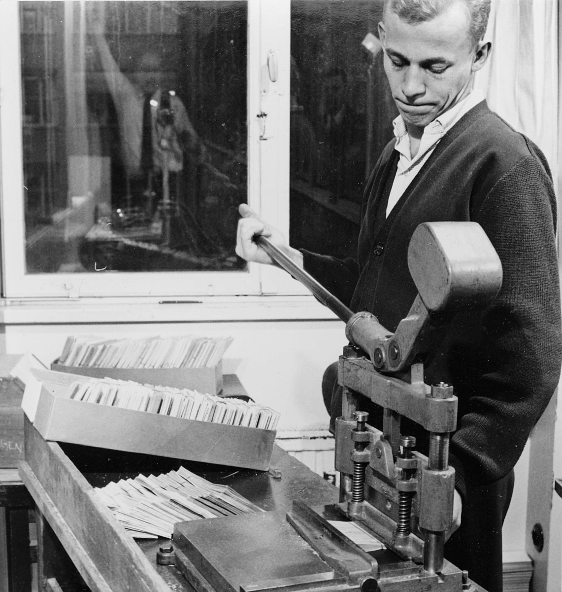 Girobokföringen. Skärning av utbetalningskort. Högerkupongerna skiljs från arkivdelarna.